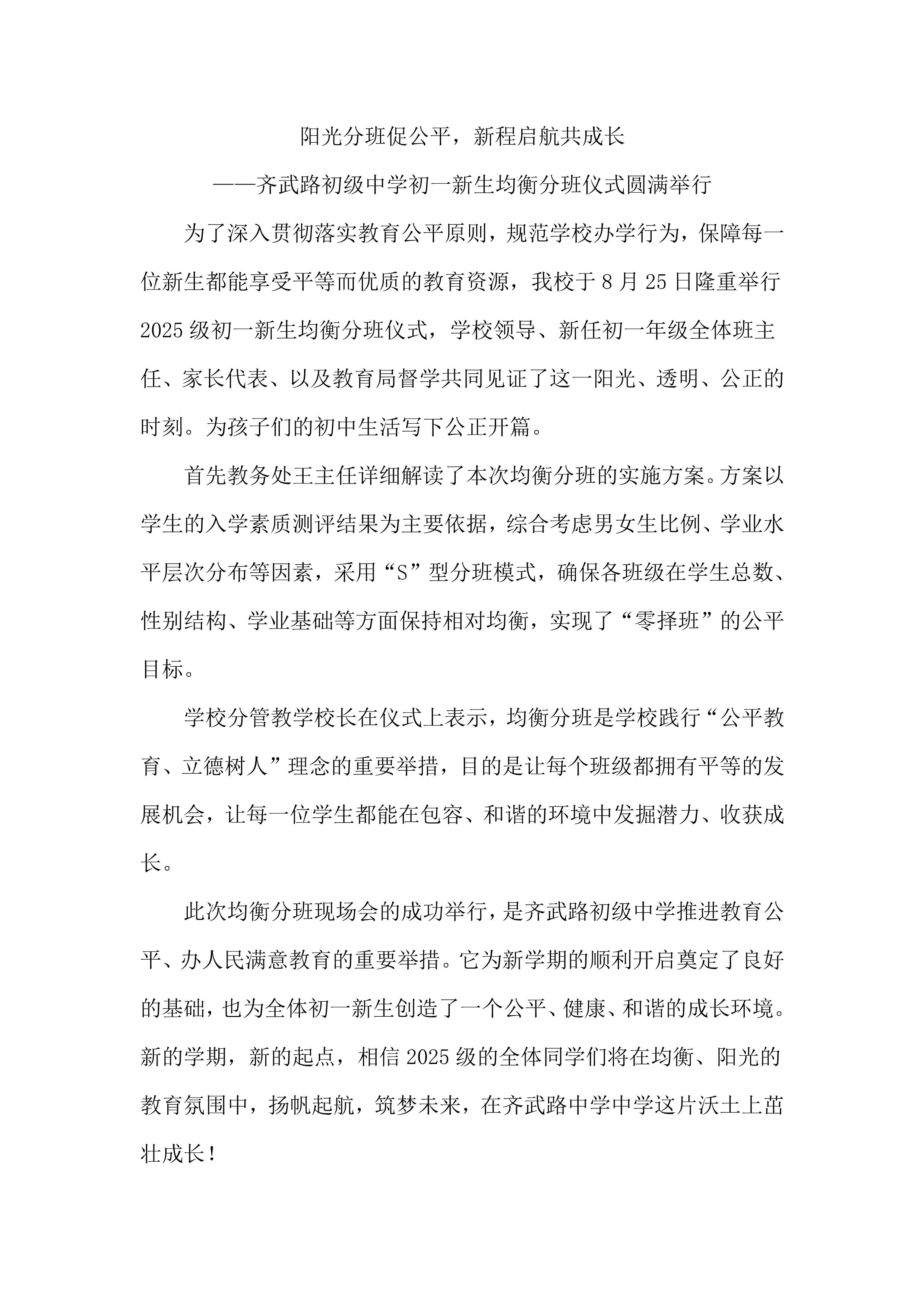 阳光分班促公平,新程启航共成长